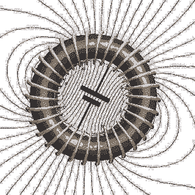 Toroidné jádra sa práveže používajú kvôli tomu, že magnetické pole jádro takmer vôbec neopustí teda zdálo sa mi to čudné ale keď som sa zamyslel, uvedomil som si, že pri takomto zapojení sa jedná vlastne nie o jednu cievku navinutú na toroide ale o dve proti sebe zapojene a tak musia magnetické siločiary opustiť jadro ! Nielen to ale jednoduchým prepínaním sa získa rotačné magnetické pole, presne ako ukazuje obrázok.