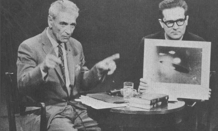 George Adamski (vlavo) hovorí v TV o návštevnikoch z venuše.